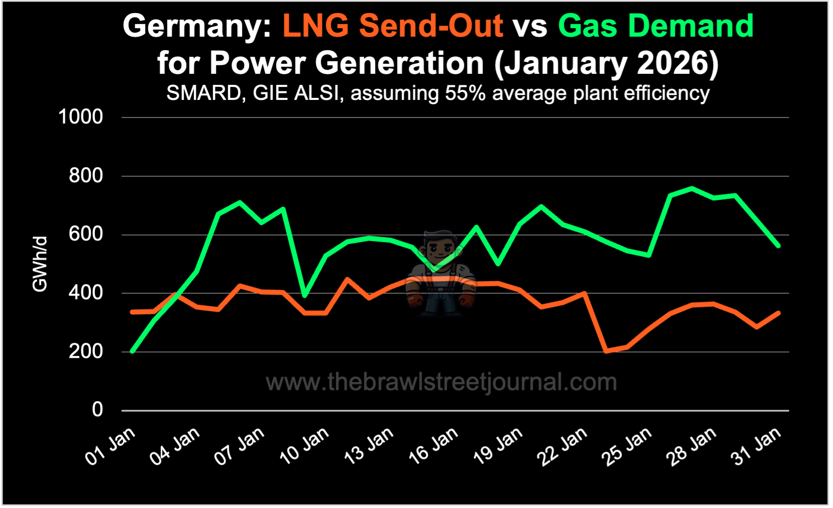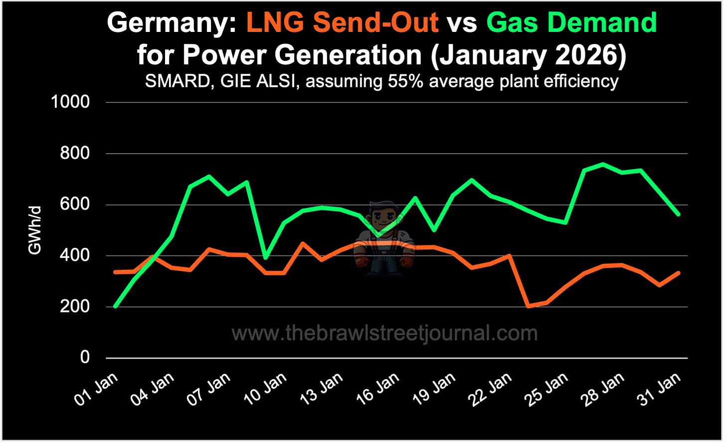Germany’s position as an energy vassal to whichever gas supplier appears the least problematic villain at the moment—Chancellor Merz recently travelled to Qatar in search of higher volumes—becomes most visible in winter. In January, LNG send-out into Germany’s gas grid was energy-equivalent to roughly 64% of the gas input required for power generation. Even if all LNG volumes had been directed to the power sector, they would not have been sufficient to cover total gas demand for electricity production.