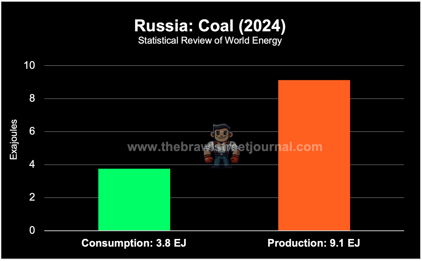 Those furnaces reach temperatures of up to 2,000°C (3,632°F). In a blast furnace, coal provides that heat and Russia has plenty of it. In 2024, it consumed less than half of what it produced: