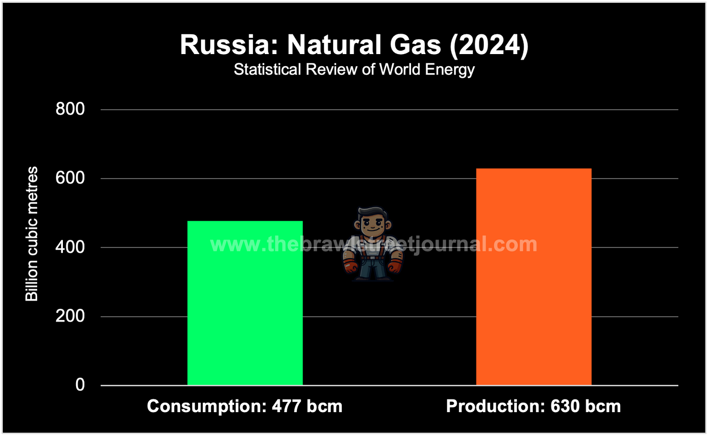We’ve got tanks, guns, and planes covered. Next are the explosives. That’s where natural gas comes in. It’s the irreplaceable energy source and feedstock for ammonia through the Haber–Bosch process. From ammonia come nitrates, and from nitrates: propellants and explosives. And again, Russia’s natural gas production exceeds its domestic use. In 2024, Russia pumped 630 billion cubic metres of gas and burned only 477.