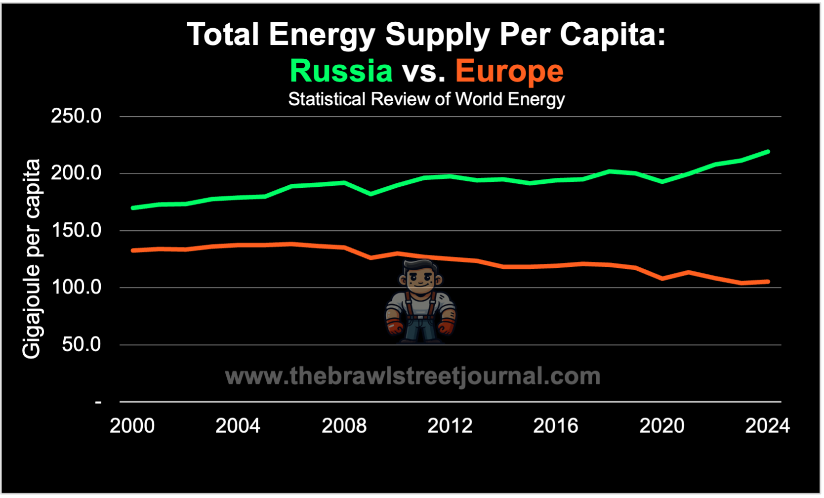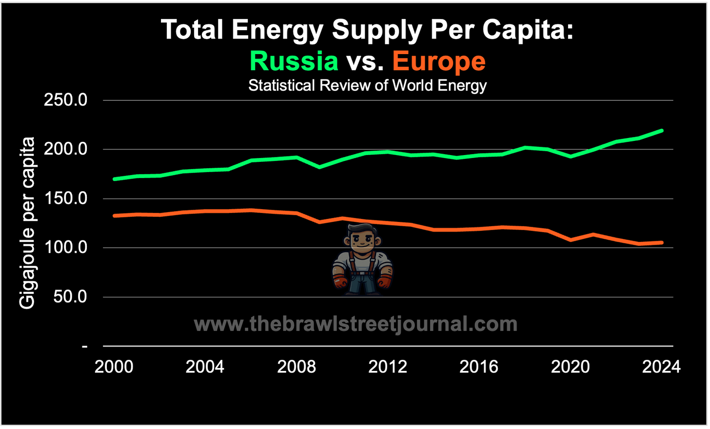 Behind those prices sits the real driver: per capita energy supply—the measure Leslie White said decides whether a society rises or falls. In 2024, the average Russian had more than twice the usable energy of a European:
