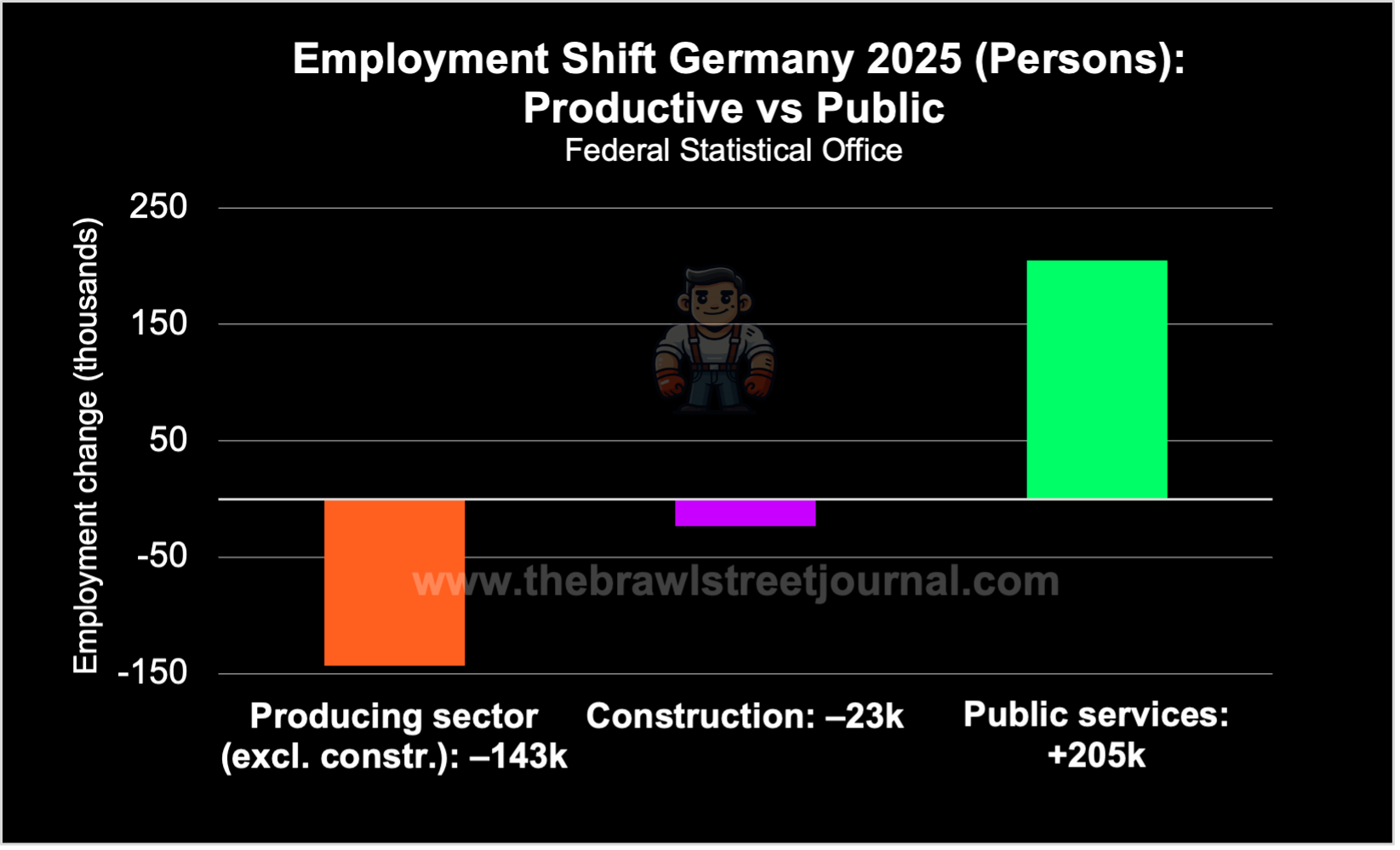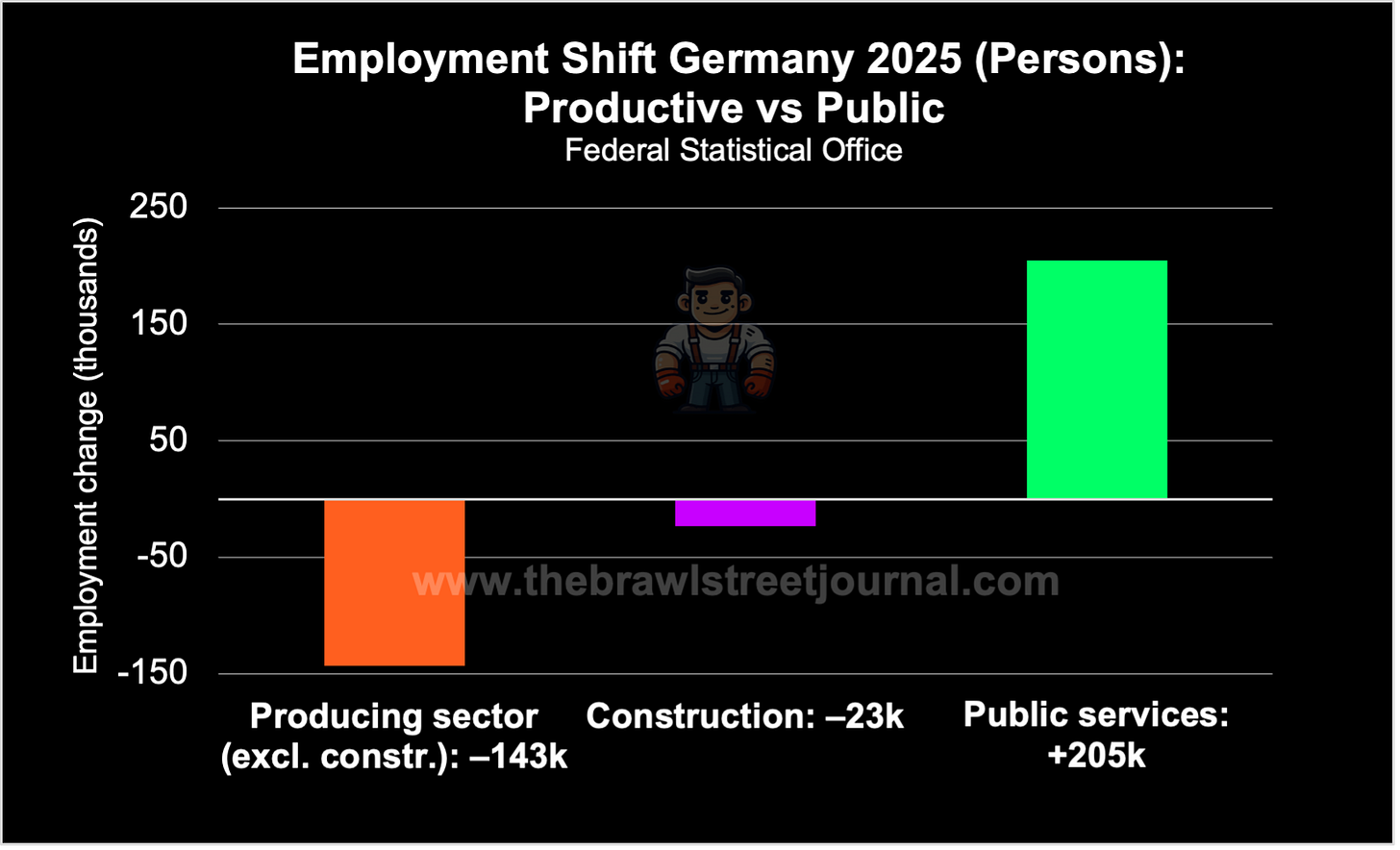 Employment has fallen where Germany’s productive core once lay. In the producing sector (excluding construction), the number of employed persons dropped sharply in 2025, falling by 143,000 (-1.8%) to 7.9 million. Construction followed the same trajectory. Employment in the sector declined by a further 23,000 workers (-0.9%), leaving 2.6 million employed in an industry that has long served as a bellwether for private investment and confidence.